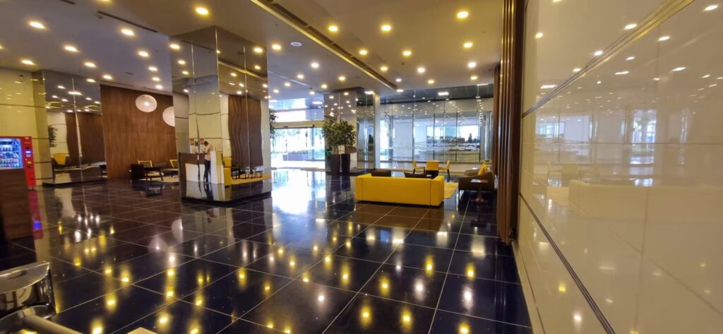 El edificio cuenta con zonas comunes para almorzar, cafés y restaurantes.